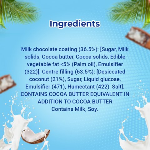 Milk chocolate coating - 36.5% (Sugar Milk solids, cocoa butter, cocoa solids, Emulsifier (INS 322)), Centre filling (63.5%) Desicoated Coconut (2%) Sugar liquid glucose Emulsifier (INS 471), Humectant (INS422), Salt, Natural flavour (vanila), Milk chocolate: cocoa solids 25% min. Contains: soy, milk.