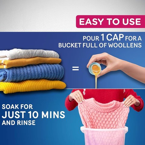 Removes stains without fabric damage or colour loss. The micro conditioners softens every thread of fabric. pH neutral formula makes clothes soft and fluffy No Soda Formula avoids damage and colour loss Suitable for Mufflers, Woollen jackets, Cardigans and Sweaters. Woolmark Apparel Care certified for washing woollen apparel. Use for both bucket and machine wash. Maintains clothes and prevents shrinking and fading.