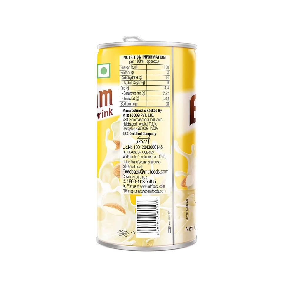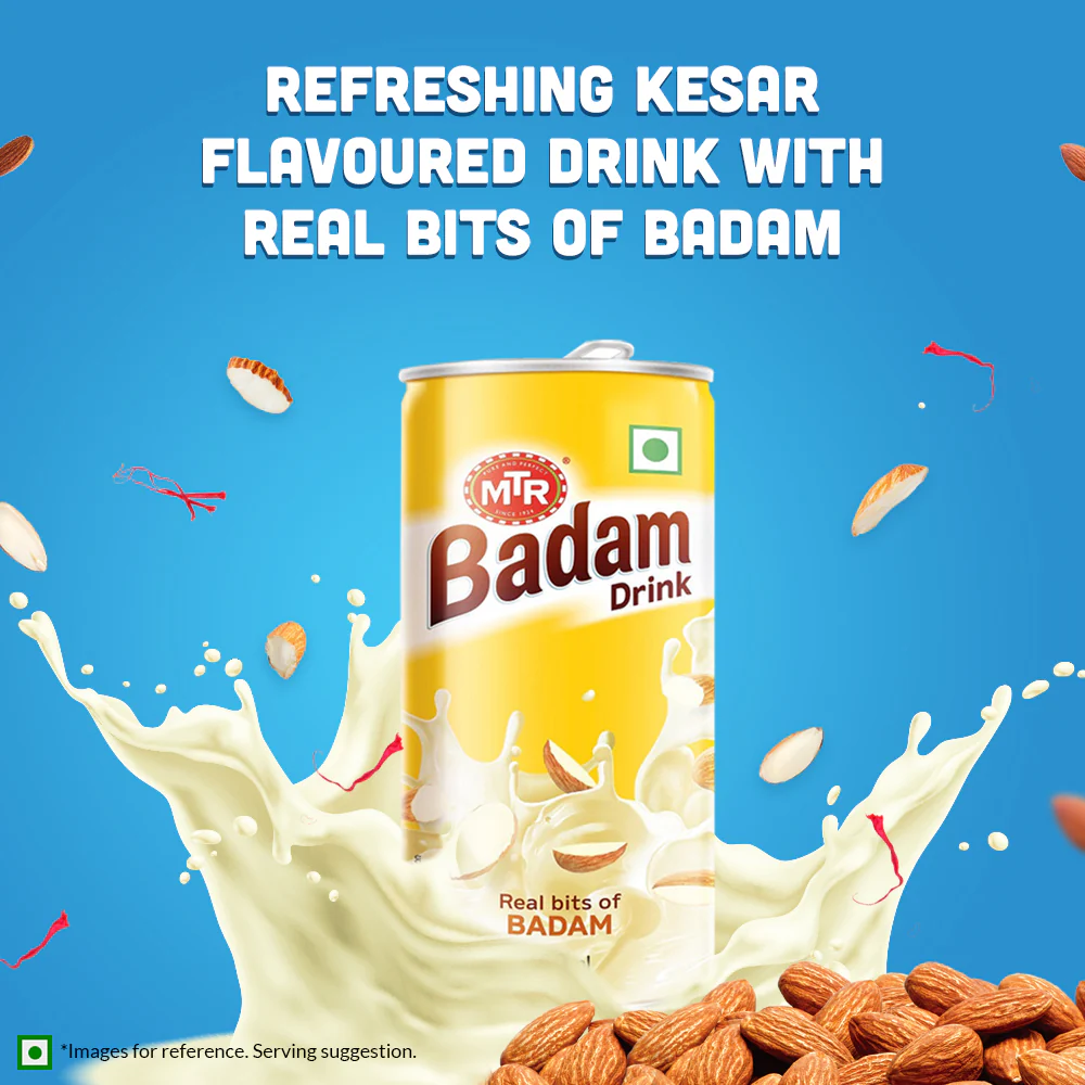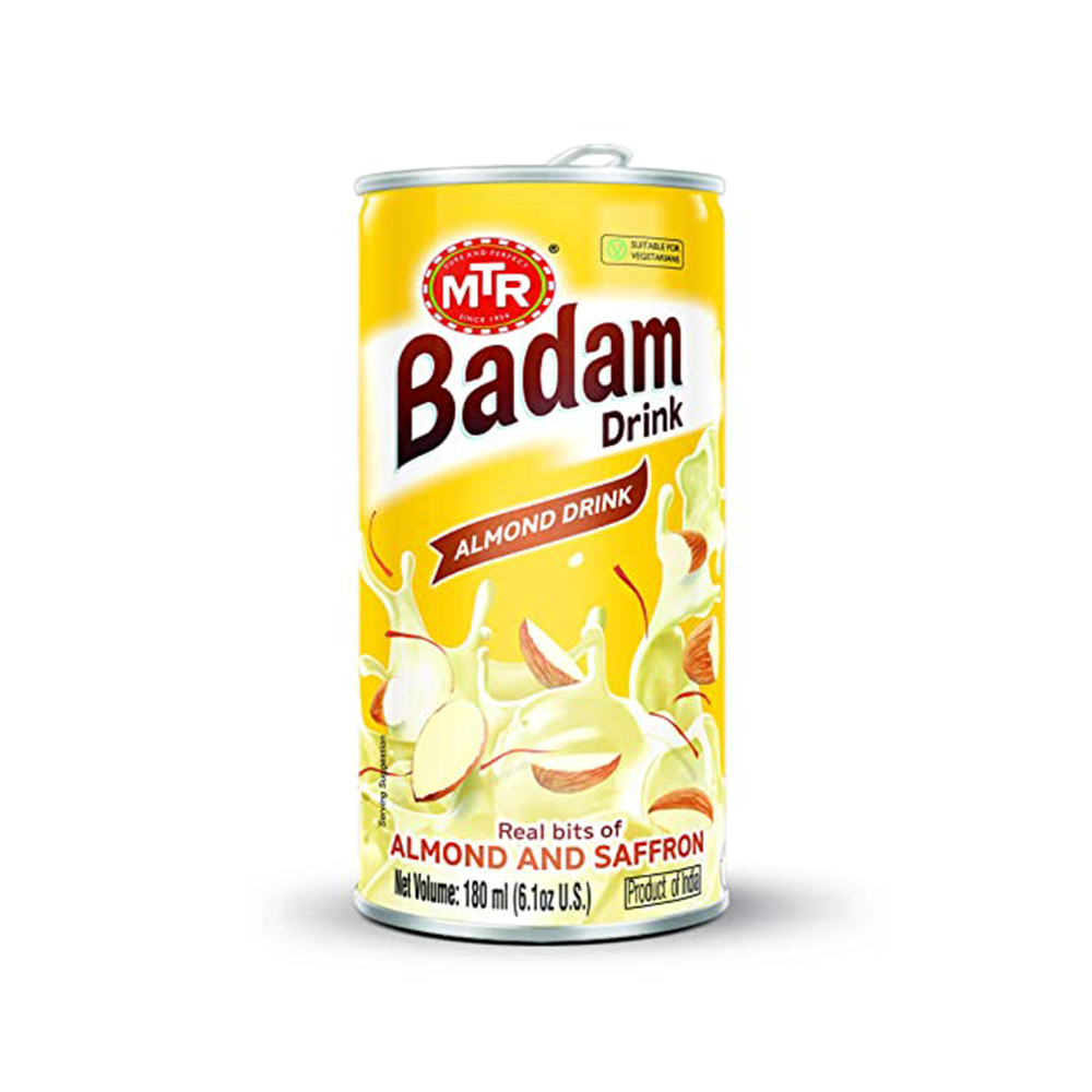 A rich concoction of almonds (badam), milk and sugar with saffron and cardamom flavouring! MTR Foods' Badam Drink is an age-old classic Indian beverage. With all the goodness of almonds, it's rejuvenation in a can!
