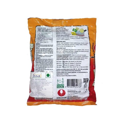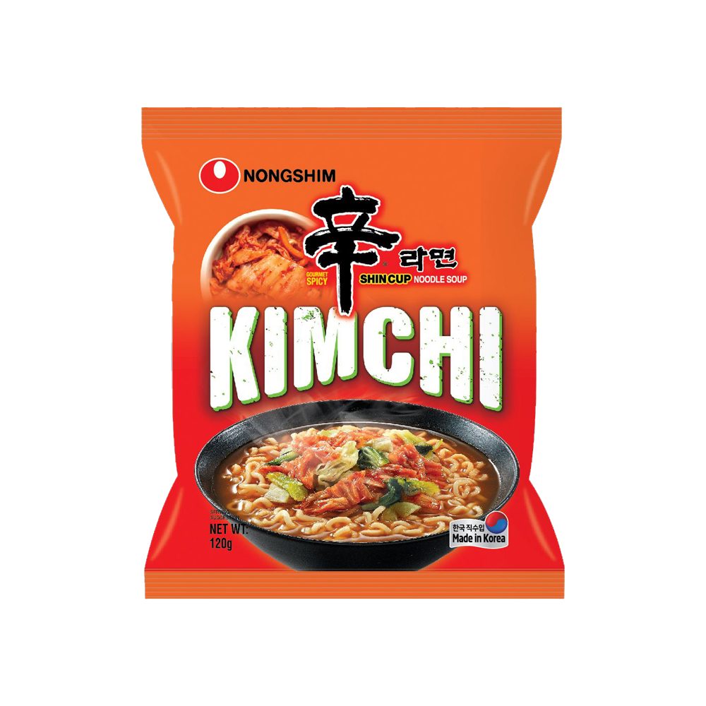 Noodle: Refined wheat flour, potato starch, palm oil, salt, mineral salts (INS339(ii)), INS452(i), INS500(i)), seasoning (yeast extract, soy sauce (0.02%), sweetener (INS420)), green tea extract, colour (INS101). Soup Powder: Seasoning (maltodextrin, hydrolyzed vegetable protein (soy, wheat), yeast extract, soy, wheat flour), salt, sugar, spices, flavour enhancer (INS627, INS631), acidity regulator (INS330), thickener (INS412), colour (INS150c). Flakes: Dried kimchi flake 37.5% {cabbage(30.5%), garlic(1.9%), red pepper (1.9%), maltodextrin, ginger}, bok choy, carrot (21.4%), green onion (9.4%)