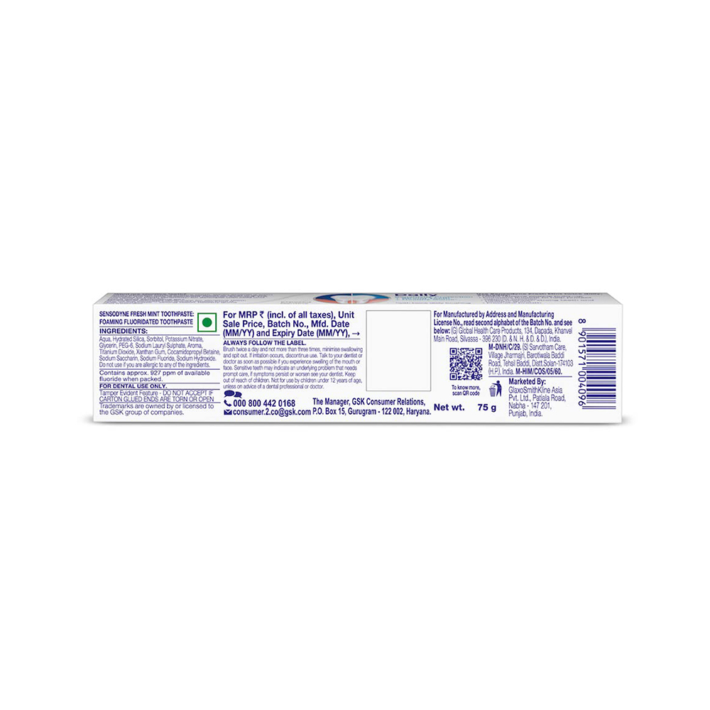 Sensodyne Fresh Gel toothpaste for daily protection of teeth against sensitivity. This toothpaste has a cool refreshing taste that leaves your mouth feeling fresh and clean. Provides daily care by soothing the sensation. This toothpaste also contains fluoride that strengthens teeth and prevents tooth decay. Provides benefits of a regular toothpaste like strong teeth and healthy gums.