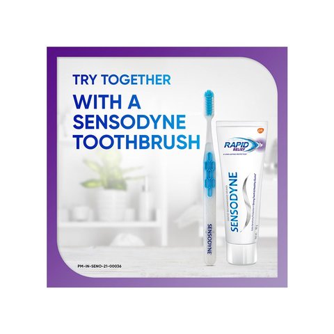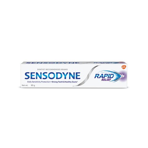 Sensodyne Rapid Relief is a daily fluoride toothpaste that acts rapidly against tooth sensitivity, while still providing the benefits of a regular paste like strong teeth and health gums. It starts to act rapidly by building a mineral-like layer over exposed dentine and within microscopic channels. The paste also builds ongoing protection with every brush.