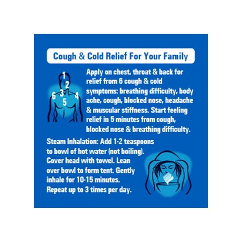 Apply on chest, throat and back for relief from 6 cold symptoms: Breathing difficulty, body ache, cough, blocked nose, headache and muscular stiffness. Start feeling relief in 5 minutes from cough, blocked nose and breathing difficulty. Steam Inhalation: Add 1-2 teaspoons to bowl of hot water (not boiling). Cover head with towel. Lean over bowl to form tent. Gently inhale for 10-15 mins. Repeat up to 3 times per day.