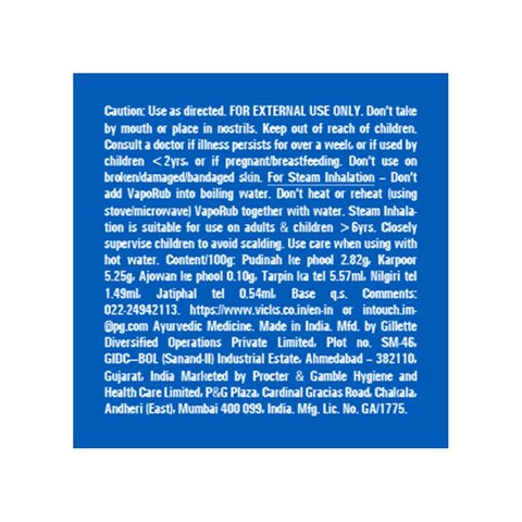 Vicks VapoRub contains Menthol, Camphor and Eucalyptus Oil, known for their therapeutic benefits in cough and cold relief. It provides effective multi-symptom relief from 6 symptoms- Blocked nose, Breathing difficulty, Cough, Body Ache, Headache & Muscular stiffness